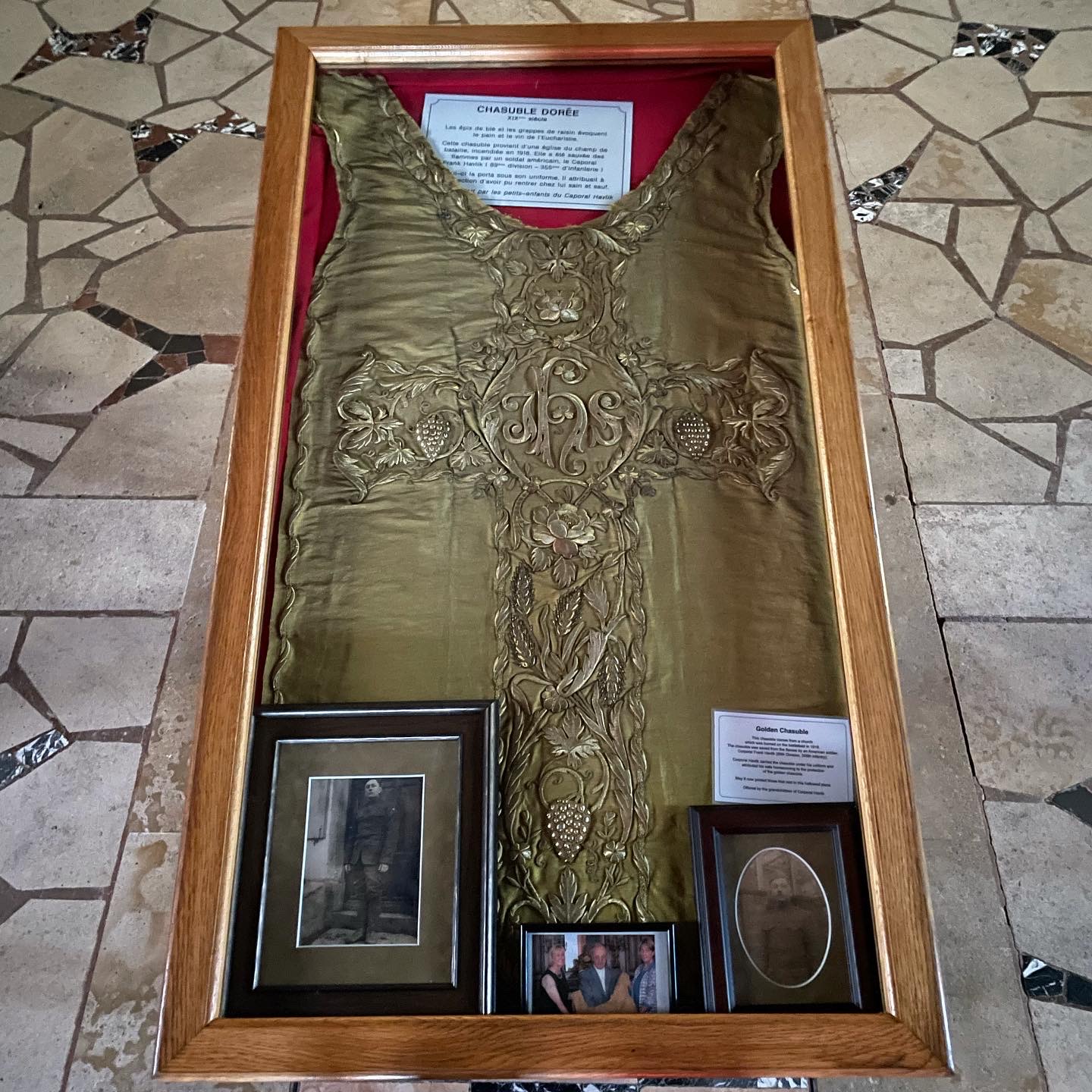 📜 En 1918, le Caporal Frank Halvik, soldat américain de la 89ème division (355ème RI) sauve vaillamment des flammes une chasuble dorée provenant d’une église du Champ de Bataille de Verdun. Les épis de blé et les grappes de raisin qui y sont brodées évoquent le pain et le vin de l’Eucharistie.
